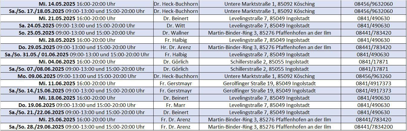 Die Adressen und Telefonnummern der diensthabenden Kinderarztspraxen sehen Sie unten in der Tabelle.